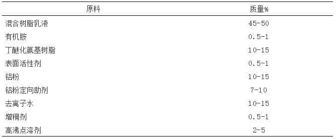 混合丙烯酸树脂乳液(自制,固含量45%) ,丁醚化氨基树脂(氰特化学),有机胺(10% DMEA),表面活性剂 (空气化学),去离子水(自制), 铝粉( 银元型,粒径25um), 铝粉定向助剂, 增稠剂,高沸点溶剂等原料,以上原料均采用进口供应商之产品。