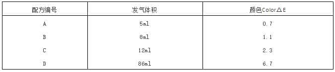 检查测量空气室内的水的体积,并进行喷涂,与试验初期未做发气试验的样品制板进行颜色比较。试验结果如表3