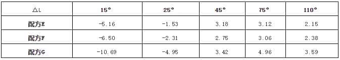 结果表明:配方E和配方F 在15°和25°亮度值L变化幅度小于配方G, 试验表明这两个配方颜色变化较小,铝粉E, F的耐剪切能力均强于G 。