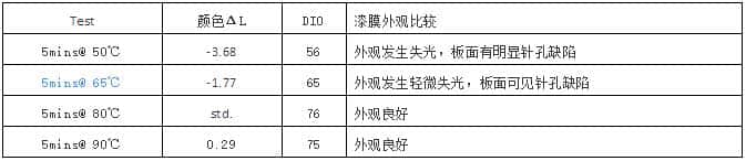 试验通过低温烘烤后湿膜固体份的百分比及样板漆膜的颜色及外观比较,确定低温烘烤条件,已得到最佳的金属漆颜色外观。